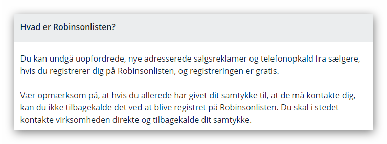 Når du har afgivet dit samtykke, så gælder Robinsonlisten ikke længere. Og du skal nu selv finde frem til alle de “samarbejdspartnere”, som ringer dig op eller sender dig mails, sms’er eller breve for at afmelde dig disse henvendelser.